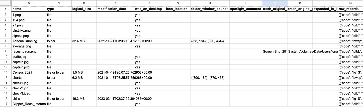 It's a Python CLI tool using only the standard library, Python 3.10+. It reads the raw binary, decodes the record types, and outputs clean CSV or JSON. One row per file, with human-readable columns for everything (while maintaining the raw data). I validated it against 368 real .DS_Store files from my MacBook.
